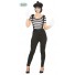 Questo vestito da mimo per donna è composto da un paio di pantaloni neri aderenti con bretelle, una maglia a righe bianche, ed un cappellino nero.